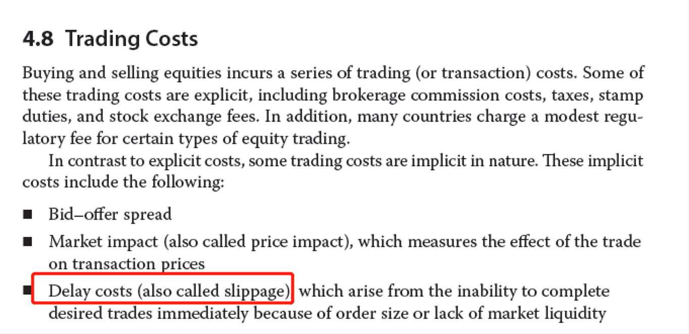 另一种是implicit cost,包括bid ask spread和slippage等。而slippage和delay cost等价(再trading中的delay cost不是一个概念)。