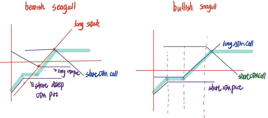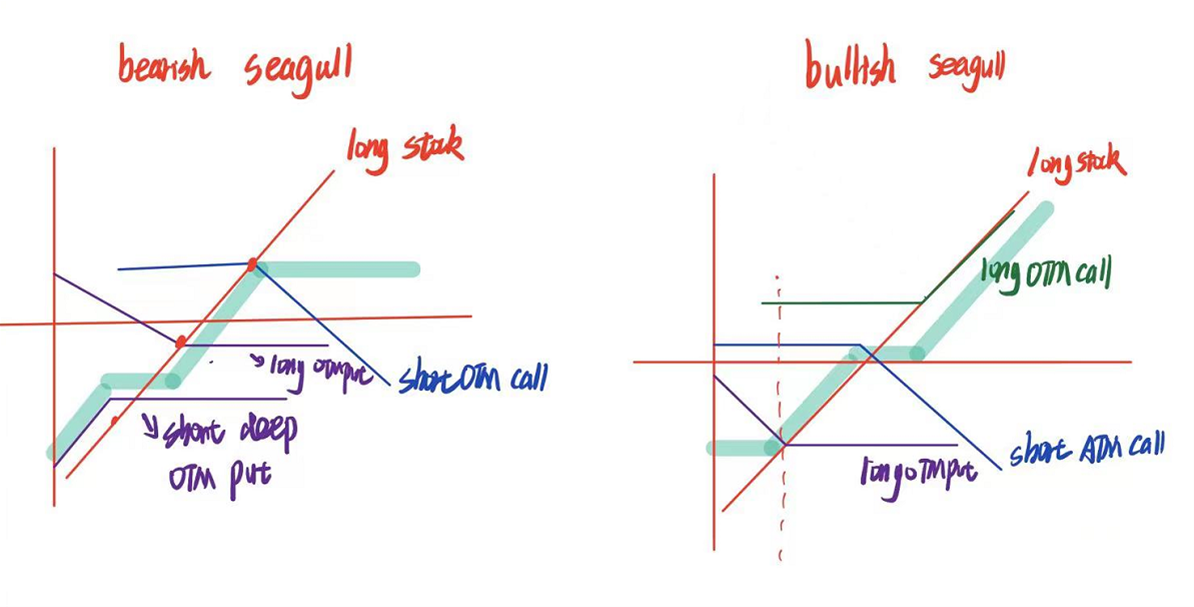 而下面绿色字的这个图是bullish seagull,上无封顶,下有保低。但他的组成中还有long stock,这里的板书中没有写。