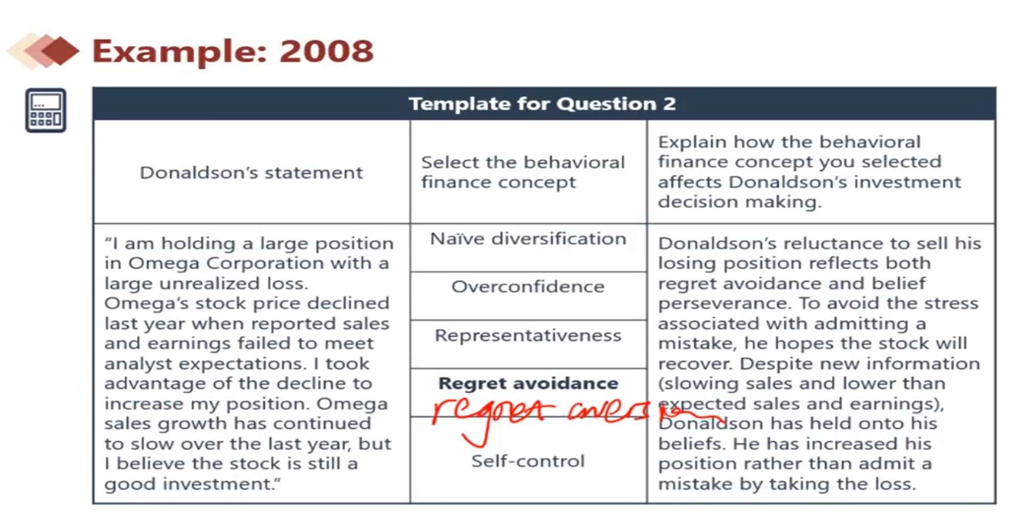 好的,是这道题,如果说RegretAvoidance是不行动,那Dnaldson的加仓行为以及他对Omega公司当下情形的自信是不是更符合OverconfidenceBias呢?