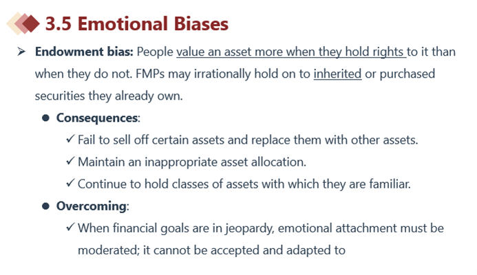 同学你好,题目给出了五个答案,只要写出其中三个即可,在这五个答案以外的都是不对的。答这种题目有的关键点就是不要太主观,不能自行去脑补,而是要看考纲是如何对每个biase进行定义的。比如Endowment的定义就是认为自己所拥有的资产会更值钱,不舍的卖掉,常见的情况是继承或是自家公司股票。因此endowment的说的不是remain control,而是不舍得卖掉,认为某样继承到的东西更有价值。