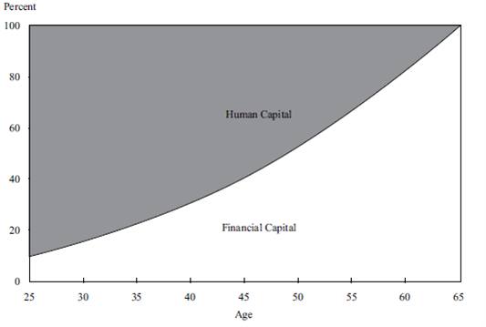 同学你好,而human capital是她未来工作所有收入的现值,这个折现率不是equity的收益率,而是无风险收益率。你可以看下图,Finnegan目前32岁,横轴是年龄,可以看见在32岁时human capital占比超过80%,因此human capital依旧是很大的,而不是很少。因此你基于human capital很低的角度来讲的话就有问题了。
