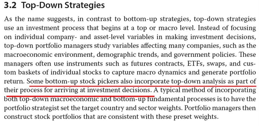 同学你好,区别bottom up和top down主要是看它最初是从什么方面入手的分析,是公司相关信息去研究的,还是从宏观经济方面去分析的。如果是从宏观经济开始分析的,那么就是top-down的,在确定好投资哪个方向之后,top-down的策略中也经常会包含运用bottom up方法来得出具体投资标的的过程。但整体还是运用的是top-down的方法。
