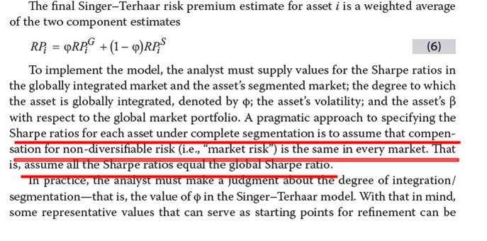 这一页的公式有错误,当fully segmented时,i市场的表现是与全球市场无关的,因此最后一项的sharp ratio应该是i市场的sharp ratio,而视频中老师用的是全球市场的sharp ratio。