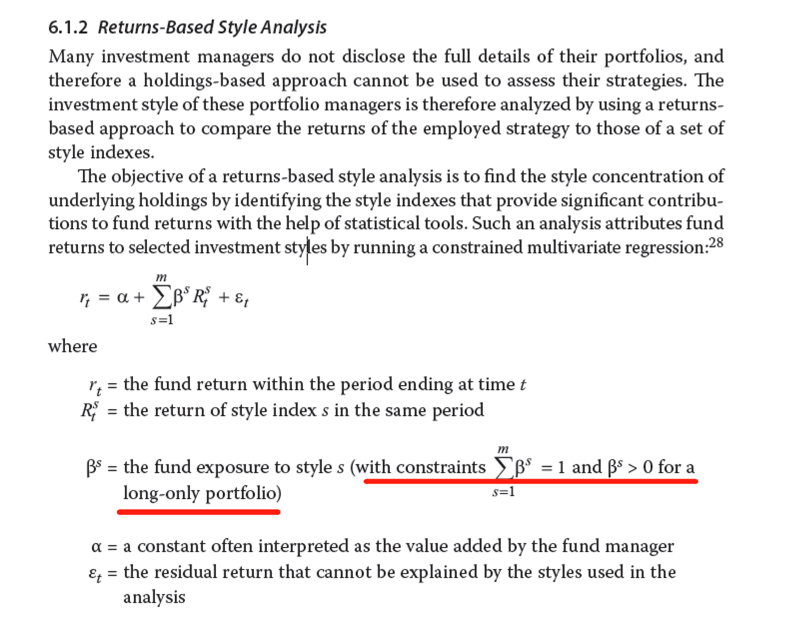 同学你好returns-based style anaylsis是constrained multivariate regression,也就是对回归系数做了限制:1、beta大于零,2、beta相加等于1。