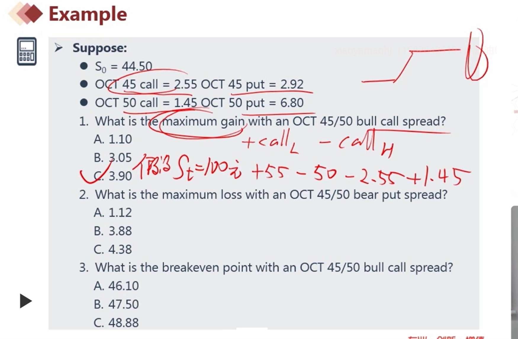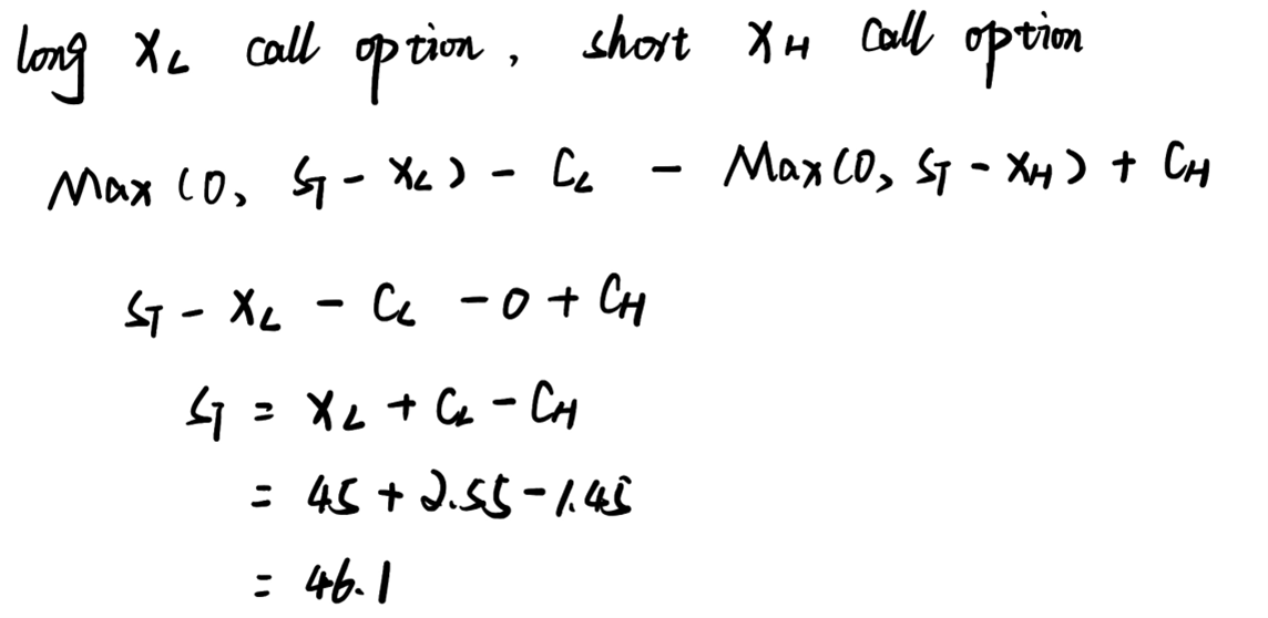 现在给出的是bull call spread,问盈亏平衡点,该点位于较高行权价不能行权而较低行权价可以行权的位置。根据Profit相关公式如下图。