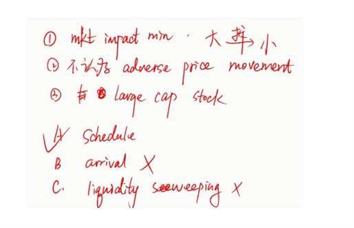 老师上课举的例子:如果市场冲击小,不认为price-reverse,大盘股选择的策略是schedule.schedule策略应该是和流动性比较好的小订单,通过题干为什么能排除arrival策略和liquidity-seeking策略?每种策略的适用情形不清楚