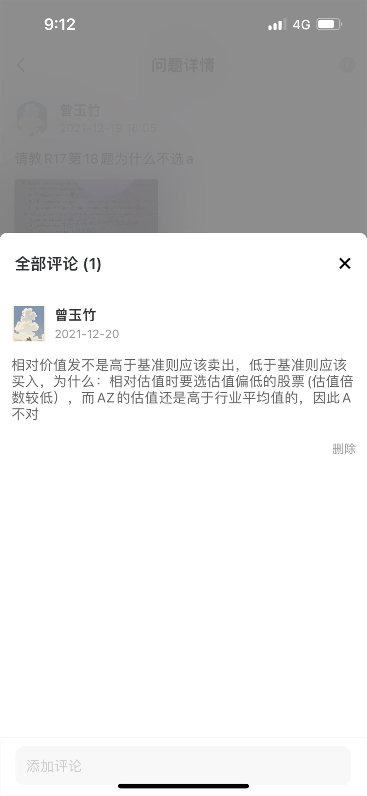 同学你好,相对估值时要选估值偏低的股票(估值倍数较低)。而AZ的估值还是高于行业平均值的,因此A不对。但是因为对比根据AZ的基本面估计出来的intrinsic value,目前该股还是相对被低估的,因此这个方法是high-quality value。
