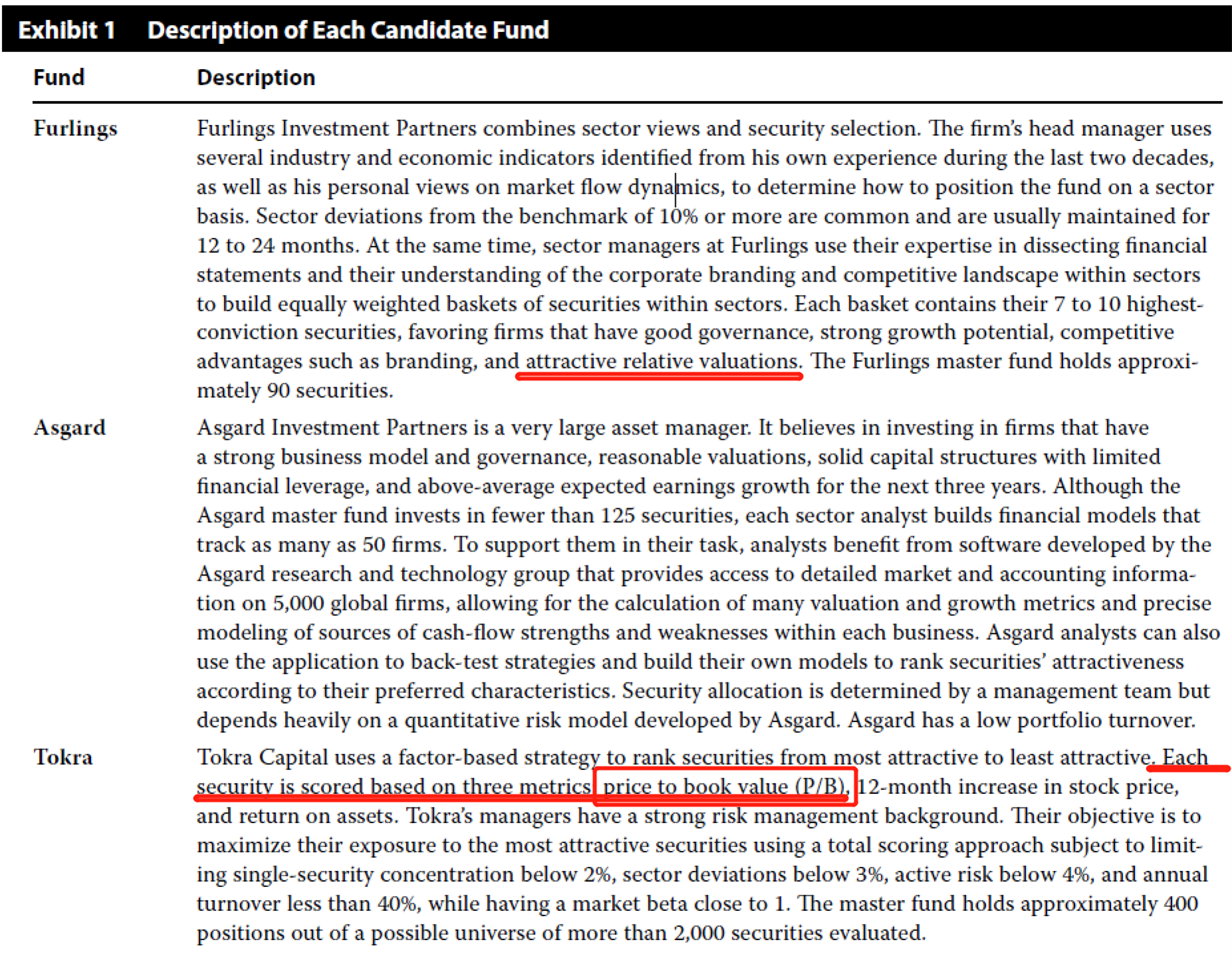 这题选C。T基金因为有一个因子是P/B,P/B和P/E作为value proxy, 选择起来是这两个指标越低越好,实际上是用它们的倒数去按高低排序的。因此T这边偏高的P/E和P/B反映出和他宣称的风格有所偏离。