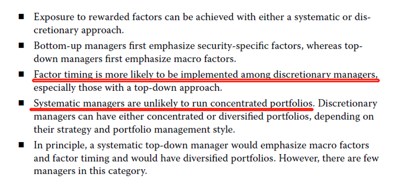 同学你好,Chen投资方法中会进行factor timing、持股集中都是更偏discretionary的特点。而chen关注security-specific facotrs说明它是bottom-up approach,因此这题选discretionary。