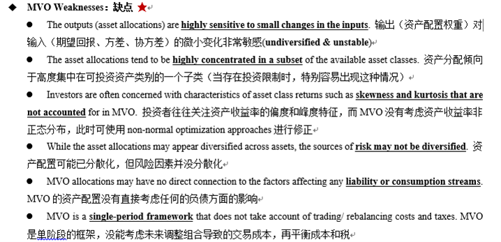 同学你好,这个考纲没有做规定,他并没有说达到多少才能算过度集中。不过题目如果问道了MVO的缺陷,你可以直接写资产配置会高度集中于部分资产大类。关于MVO的缺点,可以参考下方截图。