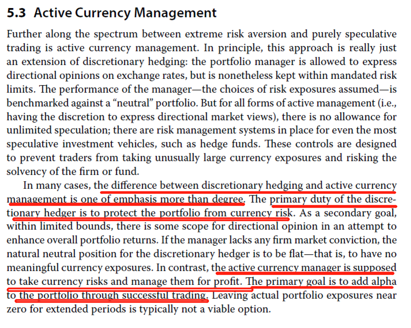 discretionary hedging的首要目标是hedge掉组合的外汇风险,而active currency management的首要目标是通过偏离获得alpha收益。