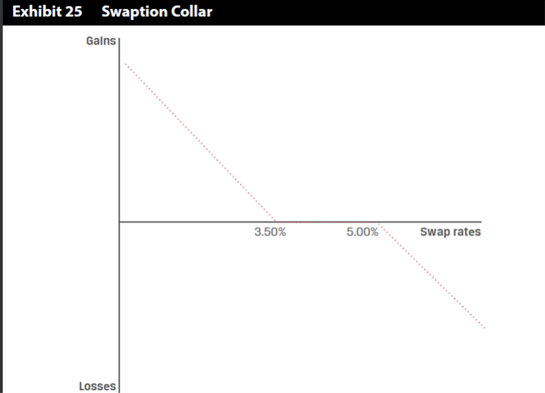 swaption collar是我预期利率下降,那么进入一个 receiver swaption,因为会在利率下跌时收到更高的固定利率,进入期权会付出期权费,我想要降低期权费直至0成本,因此会short payer swaption,以更高的执行价格在利率上涨时可能会面临损失,但是对冲期权费。整体图形如附件。