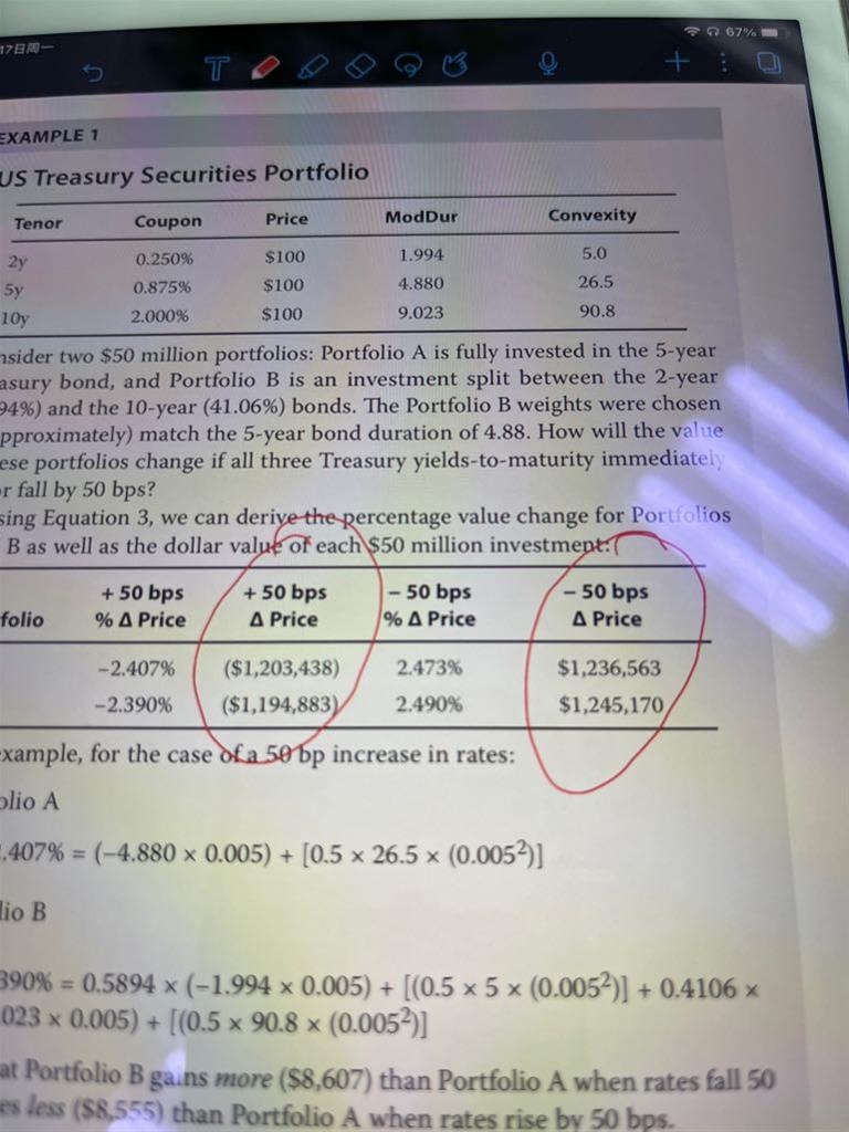 组合B是持有58.94%的2年期债券与41.06%的10年期债券,因此在处理的时候考虑各自的权重再用该公式计算价格变化,逻辑相同。