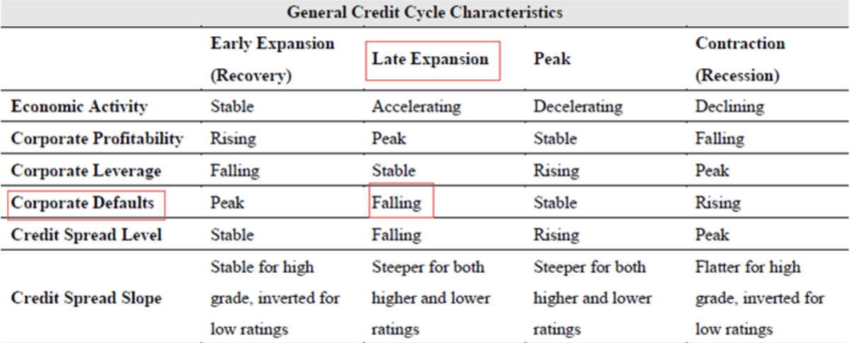 经济周期大致分为初期扩张、后期扩张、繁荣和衰退,在此主要关注公司杠杆、公司违约和信用利差变动情况。公司的盈利情况是从初期扩张期上升,到衰退期下降;公司杠杆是基于公司盈利情况的周期滞后一期,公司违约是基于公司杠杆情况的周期滞后一期