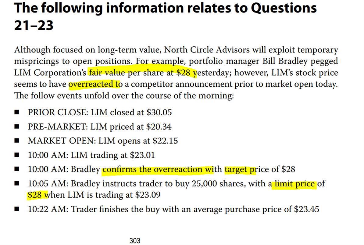 但如果Fair value (target price)不是28, 而是23.5,很接近后来的执行价格23.45. 这一题是不是在pre-trade price,和 price target 之间就难选了?