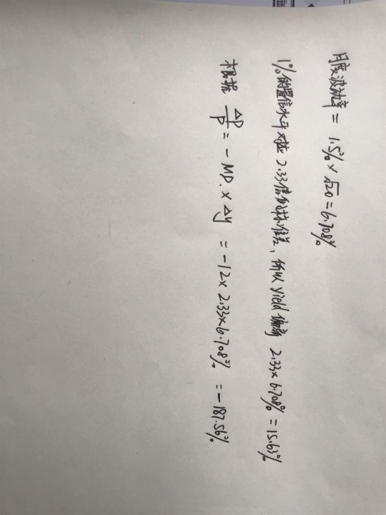 2.这里计算的是收益率变化的部分,因此要代百分号,因此这里1.5%*根号下20*2.33应该等于15.6bps,这个是利率的预期改变;