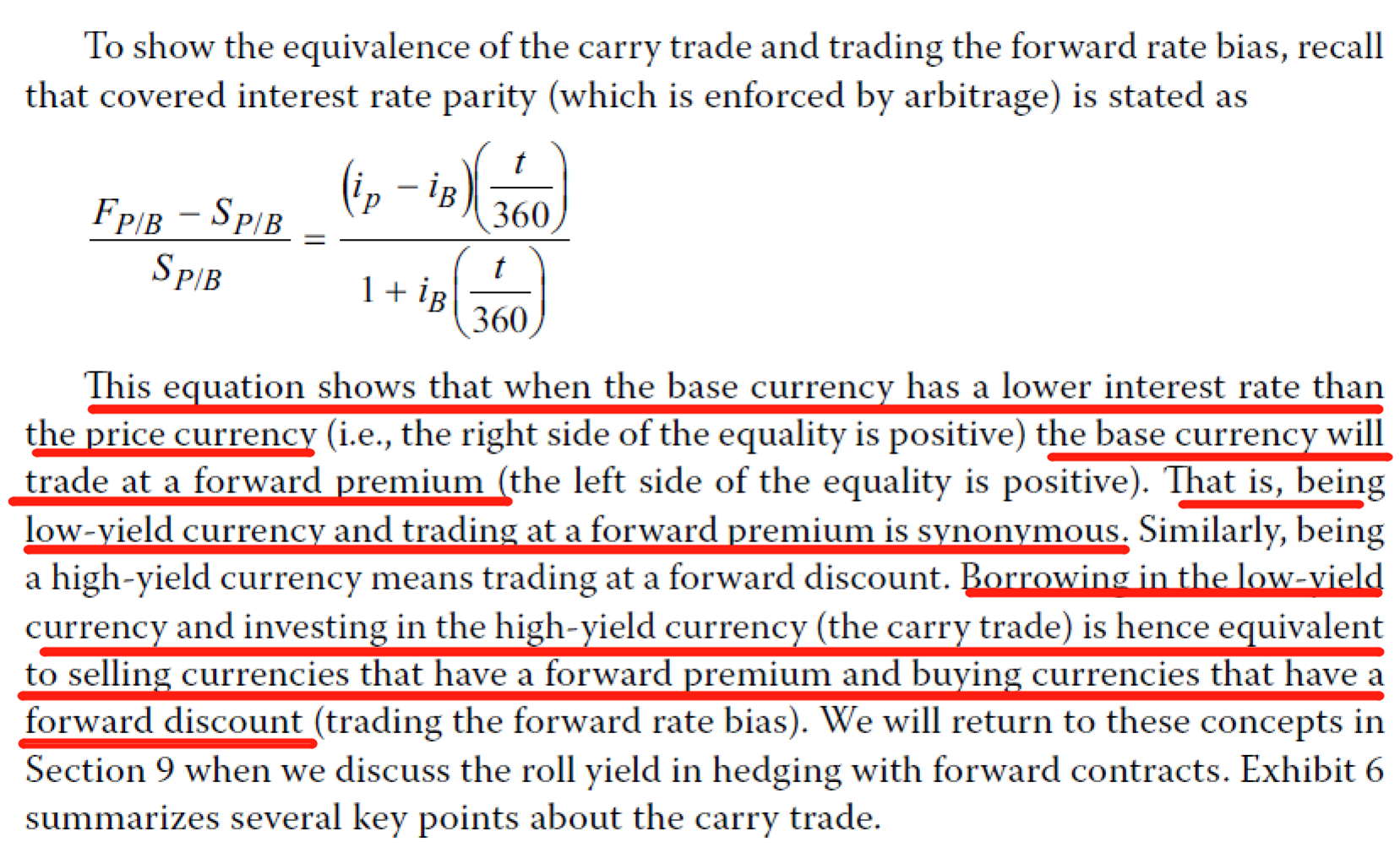 后面这句话是根据Covered interest rate parity推出来的(参考图2)。即根据IRP去给定价汇率的远期价格,那么利率低的货币就是远期溢价,利率高的货币就是远期折价。但并不意味这,到时候现货价格的变动回和远期价格一致,所以才会有forward rate bias,就是未来的现货价格和远期价格不一样,如果一样那么IRP成立。