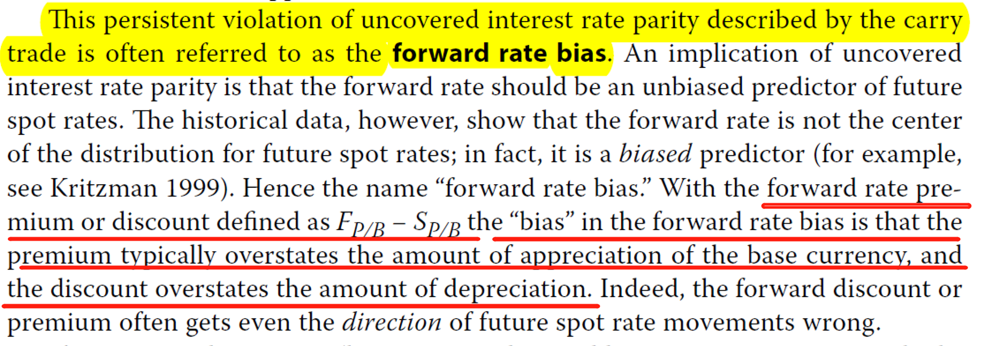 而carry trade得以实施的前提条件是未来高利率货币的跌幅小于高利率和低利率货币的利差,因此forward rate bias就是说未来现货价格和forward rate不一致,且高利率货币的贬值幅度会小于IRP预测的值,低利率货币的升值幅度也小于IRP预测的值。