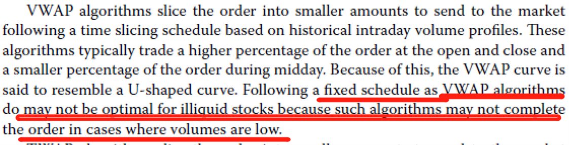同学你好,而VWAP是根据历史每个时间段内的交易量来定每个时间段内要交易多少股数,一般来说VWAP在开盘和收盘时交易的多,中间交易的少,因此在开盘和收盘期间的交易压力是较大的。因此对于整体流动性较低的股票来说,VWAP可能导致没办法全部成交。POV会利用市场的流动性,流动性好的时候多交易,流动性差的时候少交易,但如果D在一天中的流动性一直没有改善,可能会无法在当天完成交易。TWAP规定的是在细分的时间段内平均分配订单的,因此对于流动性不太好的股票来说成交概率更大,因为订单更分散,而且市场冲击成本最小。