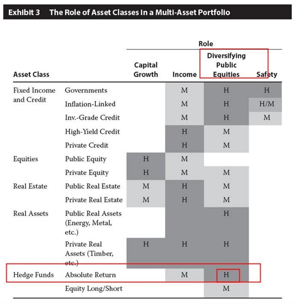 同学你好,hedge fund主要还是要看它采用了什么策略。绝对收益基金是指这类基金的benchmark是一个具体的收益率,而不是一个市场指数。他们追求的是不论是在熊市还是牛市都要获得超越某个收益率的收益。因此他通常会采用一些对冲策略,使得自己的收益率跟传统的股票资产的相关性比较低。这个策略在原版书上是没有展开讲的。只有一张图说明这类对冲基金对public equity的分散化效果是三者中最好的。也可以参考一下我找的这类基金的累计收益率的图,我们可以看出它的benchmark是一个固定收益率,和左边的相对收益型基金(benchmark是某个市场指数)的相关性是较低的。