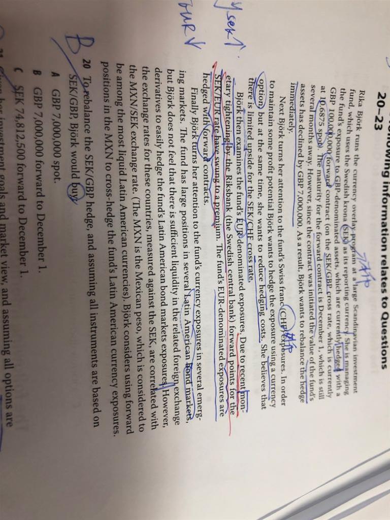 同学你好,这题问,根据最近SEK/EUR远期溢价的变化,B对EUR头寸的对冲中,哪一个因素会更高?根据题干。B使用forward来hedge他组合中的EUR头寸的(要hedge EUR多头头寸,就要short EUR forward)。现在因为瑞典央行采取了紧缩的货币政策(SEK的利率上升),因此SEK/EUR的汇率forward points转为溢价,也就是说SEK/EUR远期溢价,F>S。因为B用short EUR forward来对冲风险,EUR远期溢价就意味着在合约展期(roll)的时候,可以以更低的现价买入平掉头寸,然后再用更高的远期汇价锁定一个未来的卖价,roll yield增加。因此B是对的。