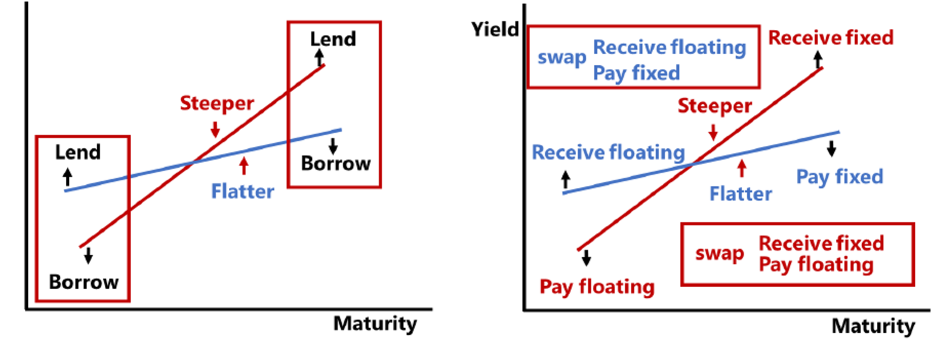 老师还是看不懂呢T_Tnn回复的图片做左半部分中,steeper那条线确定了要在短端借低长端投高,另外一条flatter的就要相反操作,那不应该是在flatter这条的短端投资长端借入了么?可是这样不就违反借低投高了么(因为flatter这条还是短端的低长端的高)