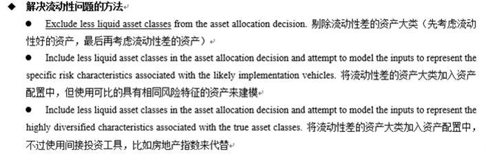 可以看下方冲刺笔记的截图,流动性较差的资产大类内部的标的资产很难达到分散化,而且缺乏准确的指数,那么A和B说法都不正确。就好比你的投资组合是房地产,如果要是做分散化投资的话那么就等于你要买很多套房子或者商场和写字楼来进行分散化投资,这不现实。那对于这些流动性差的资产大类,可以使用其他类似的但是流动性较好的资产进行替代,比如使用REITs来替代房地产进行投资,不过两者虽然都与房地产相关,可是REITs与房地产依旧有着巨大的差异,也就是C选项所表达的意思。