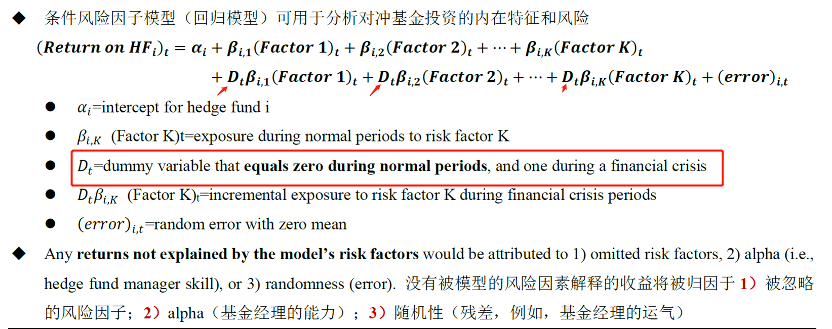 由于对冲基金策略是动态的,条件模型可以在特定的市场环境下进行分析,以确定对冲基金策略在市场危机时是否暴露于特定的风险。