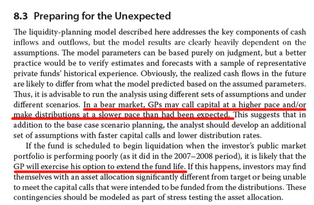 关于延长赎回期,书中给的例子是如果有一只基金它本来是要在2007-2008年股灾期间(股债表现都很差)开始清盘退出的,但因为这时候如果投资者赎回,很可能会面临极大的损失,割肉割在地板上,甚至基金资产可能卖不出去(因为市场流动性不佳),因此GP会考虑延长基金的到期期限,暂时不允许赎回。(参考电影大空头男主角的操作)