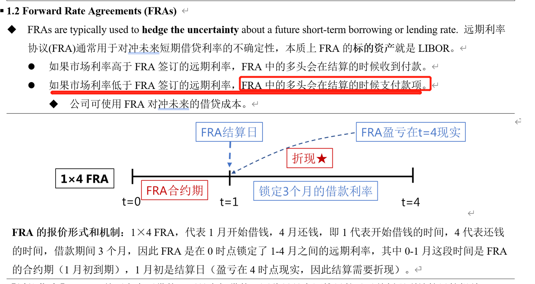 此处提到远期利率下跌,longFRA亏钱。前边提到longFRA是锁定支付固定的利率,也就是锁定的固定的远期利率下跌,那么long方应该是支付的固定利率少了,为什么还是亏钱呢?