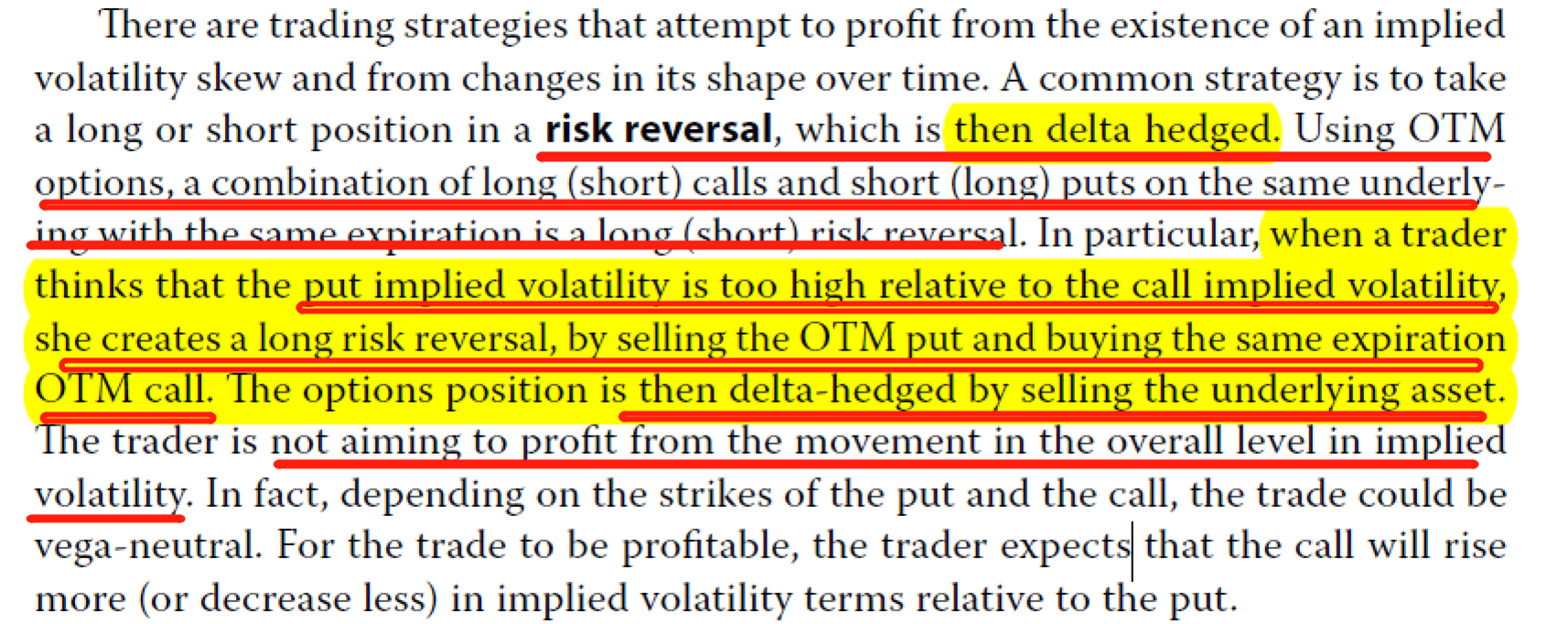 如果说人们认为OTM put的implied volatility相对于OTM call来说太高了,未来很可能会下降,那么就可以long risk reversal。具体操作是long OTM call,short OTM put,然后short underlying asset来进行delta hedge。