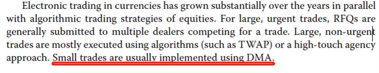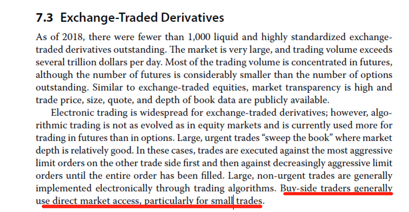 statement 4 :小的外汇订单和交易所衍生品交易通常通过DMA来执行。外汇和交易所衍生品的小单适合用DMA交易,这个是对的,书上有原话(见图)