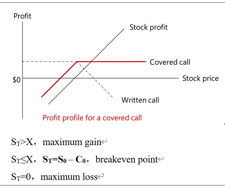 同学你好,long stock+short call就构成了covered call。covered call的payoff如下图。即使stock涨再多,covered call的也只能获得最大收益。收益的上行空间被限制住了。