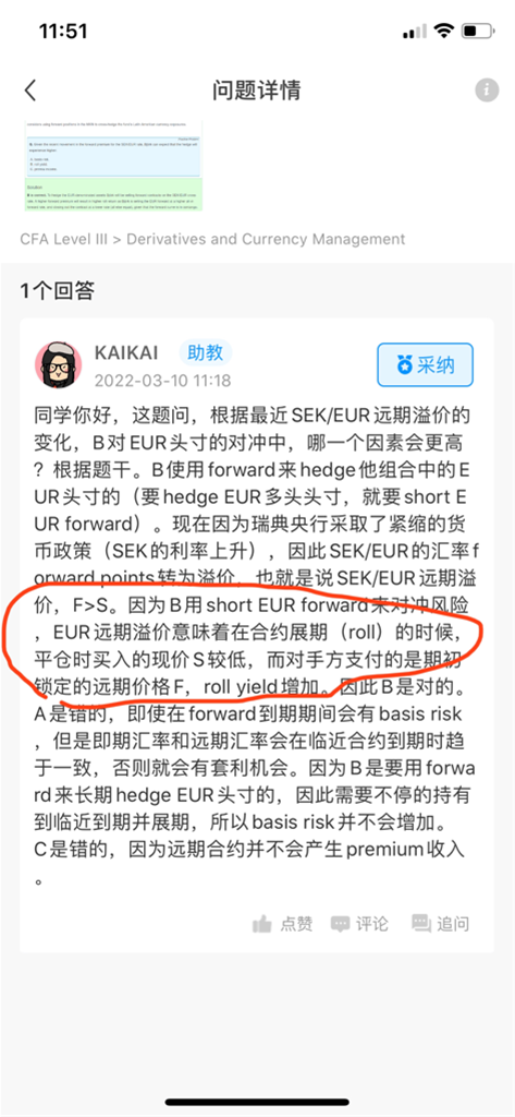 同学你好,这题问,根据最近SEK/EUR远期溢价的变化,B对EUR头寸的对冲中,哪一个因素会更高?根据题干。B使用forward来hedge他组合中的EUR头寸的(要hedge EUR多头头寸,就要short EUR forward)。现在因为瑞典央行采取了紧缩的货币政策(SEK的利率上升),因此SEK/EUR的汇率forward points转为溢价,也就是说SEK/EUR远期溢价,F>S。因为B用short EUR forward来对冲风险,EUR远期溢价意味着在合约展期(roll)的时候,平仓时买入的现价S较低,而对手方支付的是期初锁定的远期价格F,roll yield增加。因此B是对的。