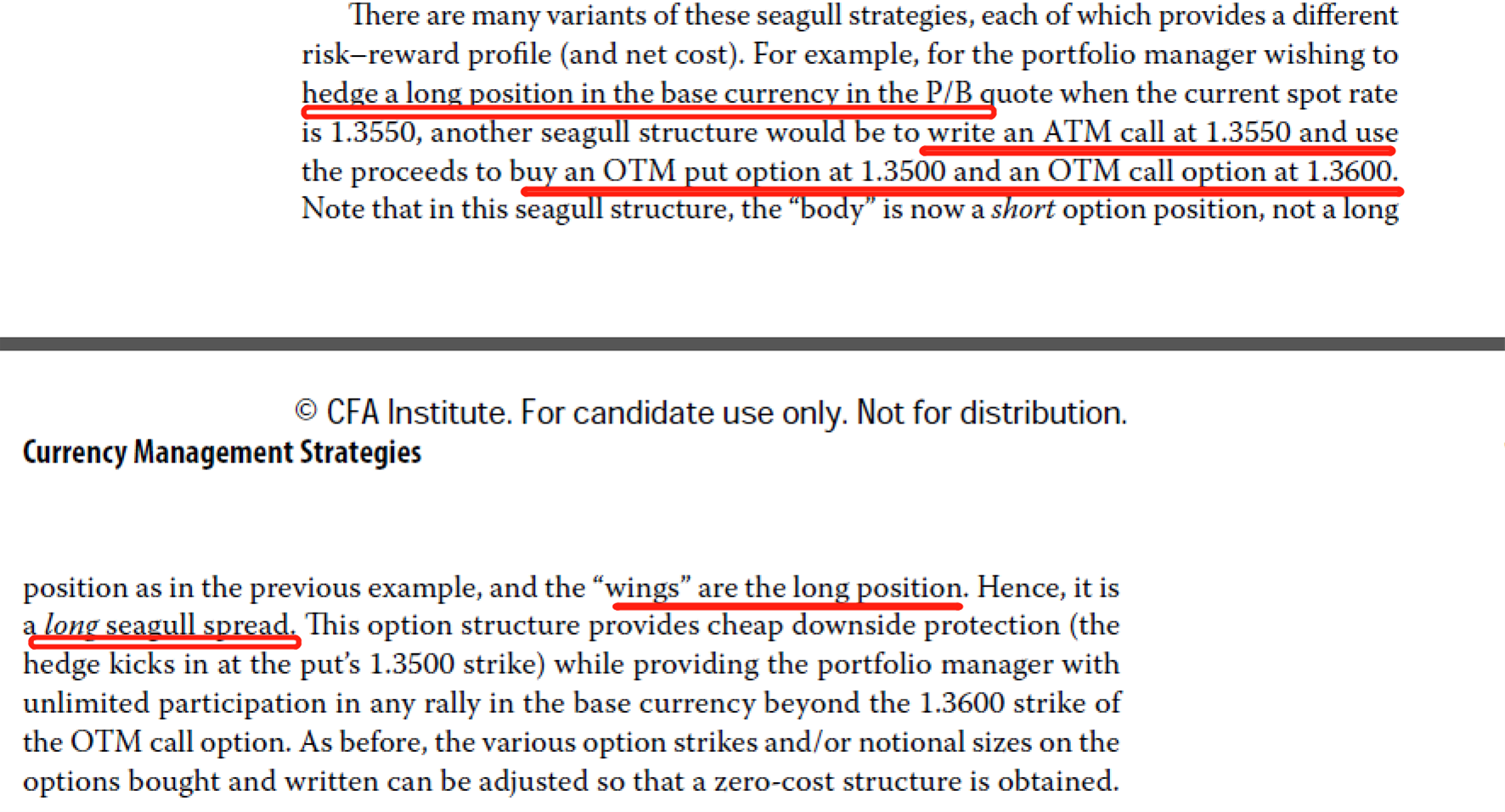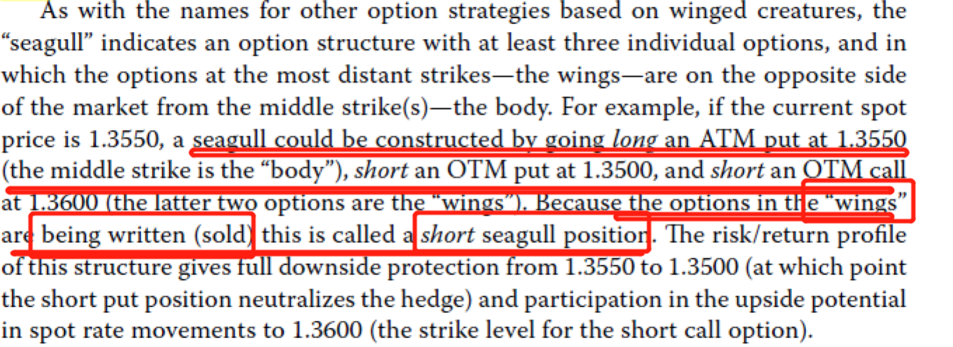 参考的原版书,咱们这个题目中确实应该是long seagull spread。根据原版书,判断seagull是long还是short,主要看构建seagull的两翼,也就是两个OTM option是long还是short,都是long那么本策略就是long seagull spread,如果都是short 那么就应该是short seagull spread。
