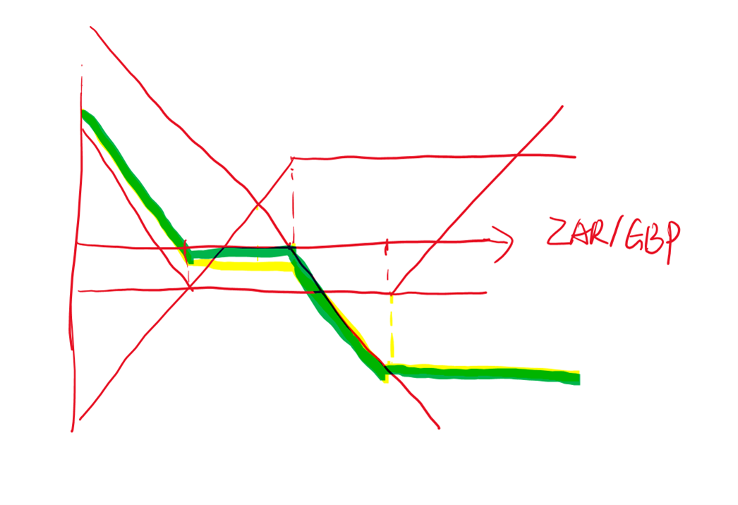 现在Khan说这三个option可以用来进行这样的一种对冲结构,即下行风险有限,在25-delta这个strike price开始,可以有完全的对冲。这个结构还会保留无限的上行潜力,但上行的趋势要到ZAR/GBP的汇率达到25-delta strike price才会开始。这个对冲结构构建成本比较低,因为包含了option writing。