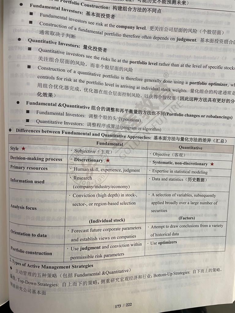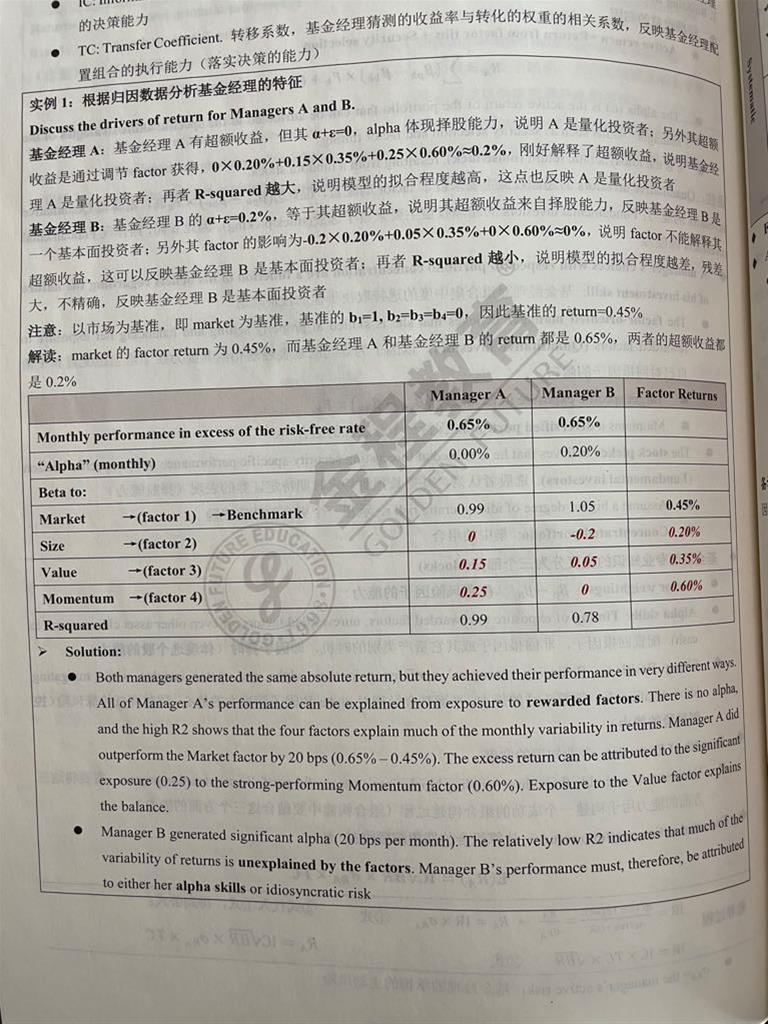 老师,从冲刺笔记上册182页例题,是否能给冲刺笔记173页的表格增加一条总结:fundamental investor‘s performance is attributed to either alpha skills or idiosyncratic risks. 而quantitative investor’s performance is attributed to exposure to rewarded factors. 老师,您觉得,抛开例题,以上两条对比我理解的对吗?