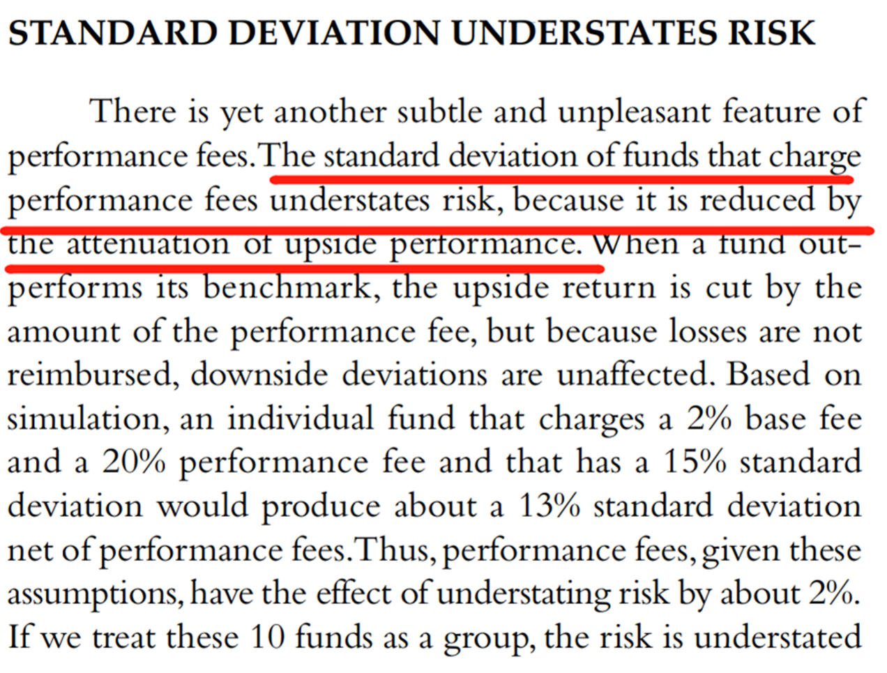 如果我们用net active return(扣除费用后的active return)的标准差来评估组合的风险,会低估组合的风险。在业绩差的时候因为基金经理不会分担亏损,因此下行波动率不受影响,在组合业绩较好的时候,因为收取了业绩提成,业绩的波动性降低了,导致整体的业绩的标准差是偏低的。