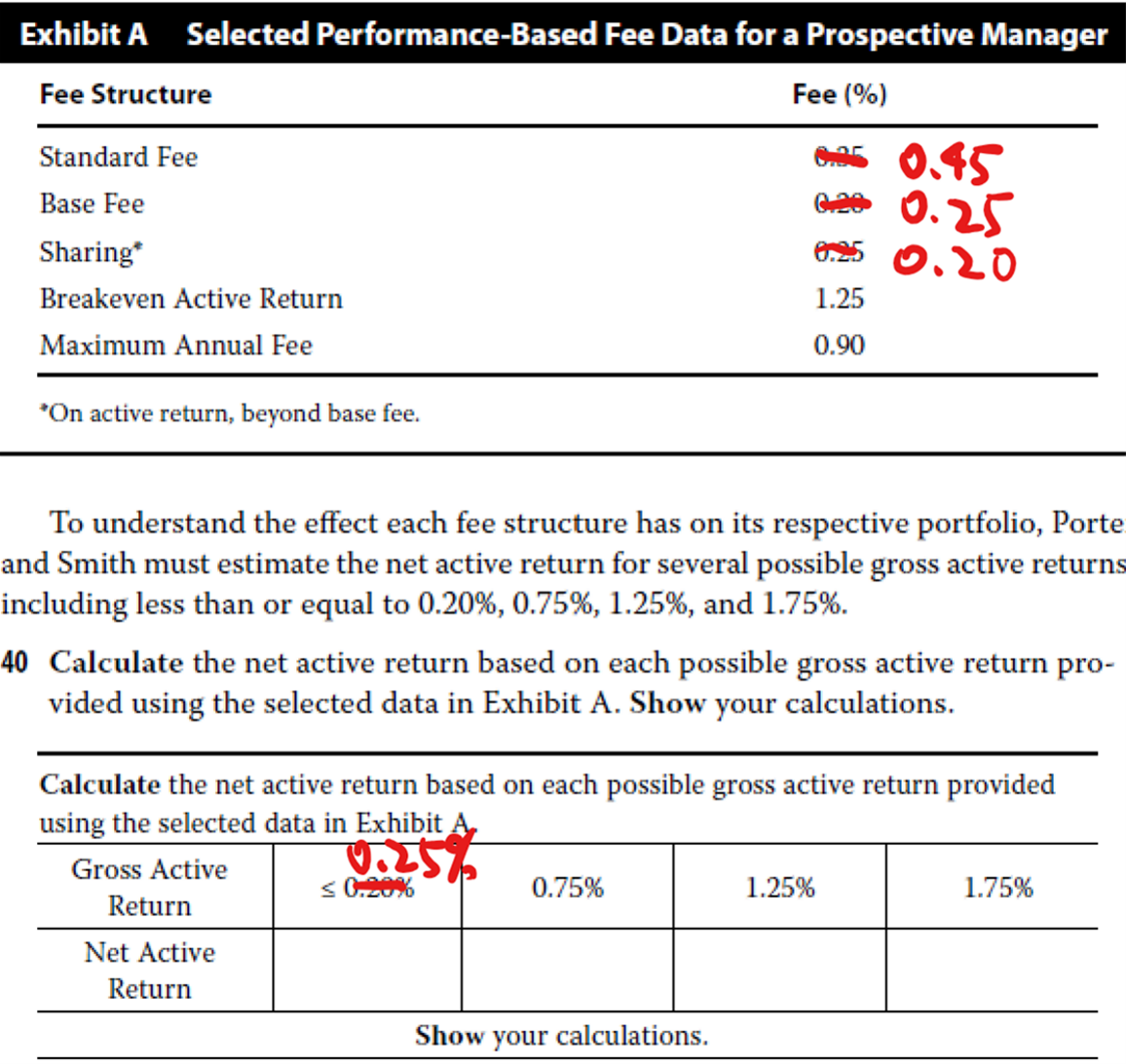 同学你好,这题我觉得是有问题的,数字应该没有编好。当active return = 1.25%时,通过base fee+sharing fee加起来应该等于standard fee。但这里算出来是不等的,而且他说在breakeven return的时候没有sharing fee也是有问题的,如果没有sharing fee, 那么standard fee应该和base fee一样。