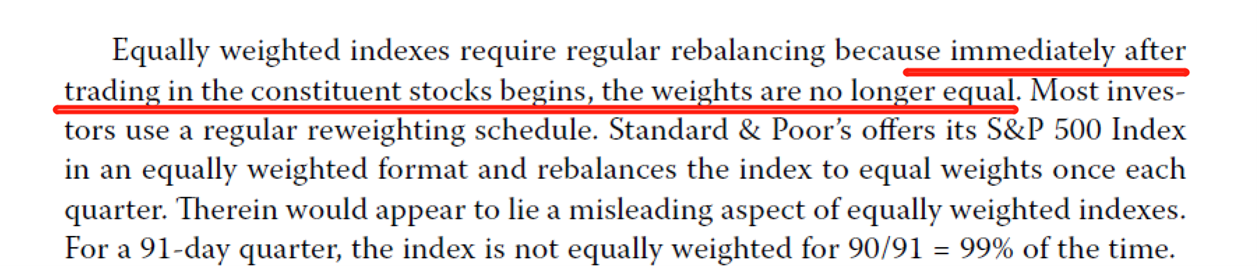 同学你好,等权重的只有在再平衡完成的那一刻是等权重的,之后只要有一只成分股股价变就会使得等权重不再成立。