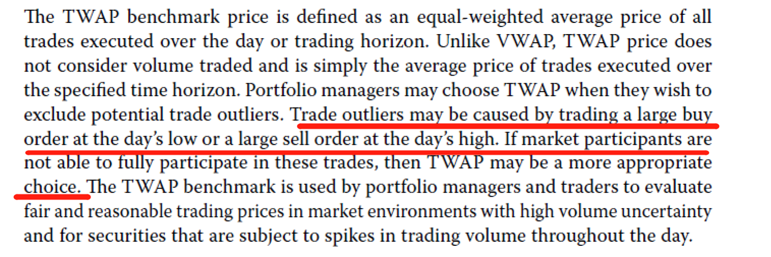 同学你好,这里的例子是有些问题。应该和投资者的大小关系不太大。用VWAP做benchmark的投资者,就是要用VWAP去作为指标评价自己交易的。例如,投资者想买入一只股票那么他的目标是平均买入成本和这只股票的今天实际的VWAP接近或更低。VWAP的计算受到outlier的影响,而outlier又通常是在价格低点出现大量买单,或在高点出现大量卖单。那么,如果投资者无法或无意把握住这些高点或低点,且参与这些交易的话,就不合适使用VWAP,因为无法买的低卖的高就会使投资者的交易成本一直比VWAP差。这时,可能TWAP会更加合适。