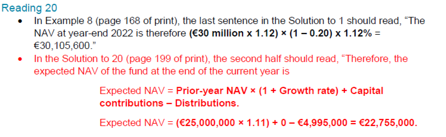 老师,你好,原版书课后题 reading 20的第20小题,题目问的是end of the current year的NAV,不是应该用NAV(t)=NAV(t-1)*(1+g)-D(t-1)吗?而原版书的解答为什么还需要再乘以一个(1+g)呢,这样算出来的不应该是NAV( t+1)了吗?