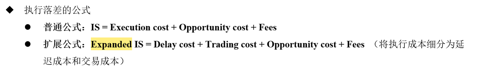 同学你好,指的是把执行落差进行进一步拆分,拆成了Delay cost + Trading cost + Opportunity cost + Fees四部分构成。具体请同学参考IRENE 老师R25(1)Trade Execution第二视频5分钟左右开始,有详细讲解相关知识点。