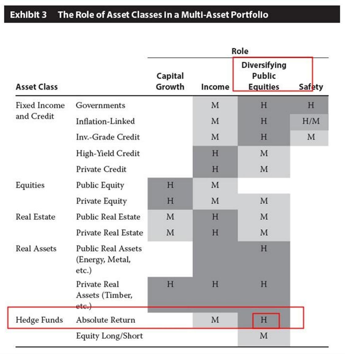 同学你好,hedge fund主要还是要看它采用了什么策略。绝对收益基金是指这类基金的benchmark是一个具体的收益率,而不是一个市场指数。他们追求的是不论是在熊市还是牛市都要获得超越某个收益率的收益。因此他通常会采用一些对冲策略,使得自己的收益率跟传统的股票资产的相关性比较低。这个策略在原版书上是没有展开讲的。只有一张图说明这类对冲基金对public equity的分散化效果是三者中最好的。也可以参考一下我找的这类基金的净值图,我们可以看出它的benchmark是一个固定收益率,和左边的相对收益型基金(benchmark是某个市场指数)的相关性是较低的。