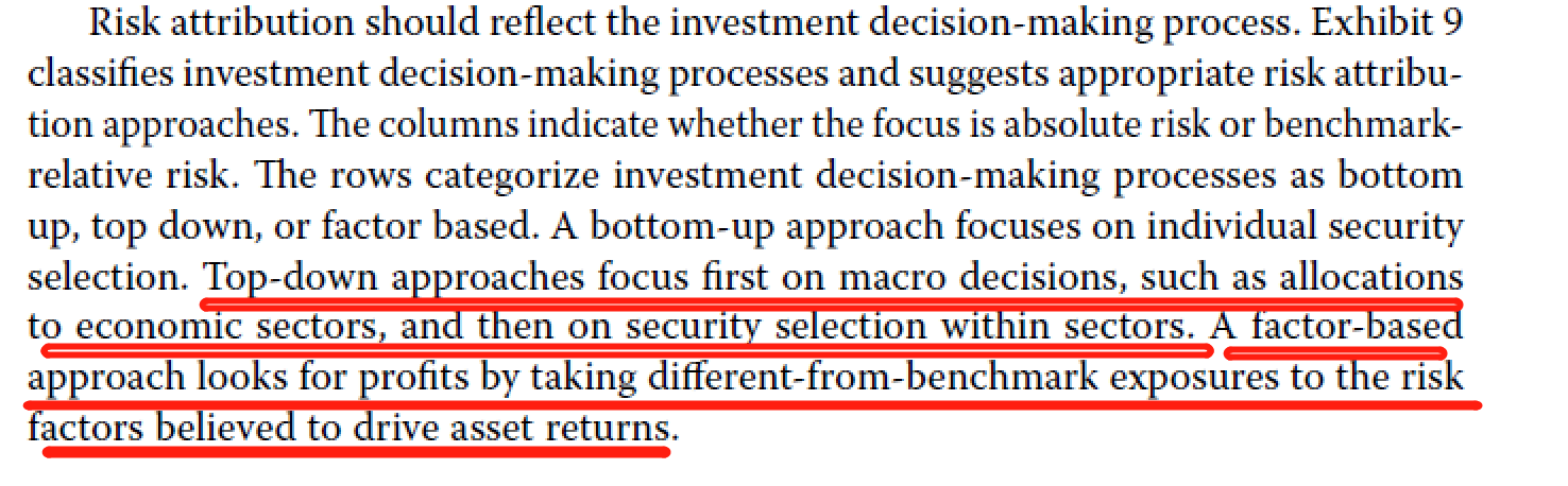 Top down主要聚焦于宏观方面的决策,从宏观分析出发,来决定sector配置的决策(哪个板块未来有潜力就多配点,没潜力就少配点),最后在板块内选股。而sector的配置属于unrewarded factors,也算是一类因子。