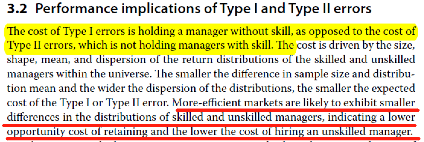 本题问的是Type I和Type II error预期成本之差最可能是以下哪中情况,即Type I error造成的雇佣没能力基金经理的成本与Type II error的造成的没雇佣有能力的基金经理的机会成本的差异,什么时候更高,什么时候更低。