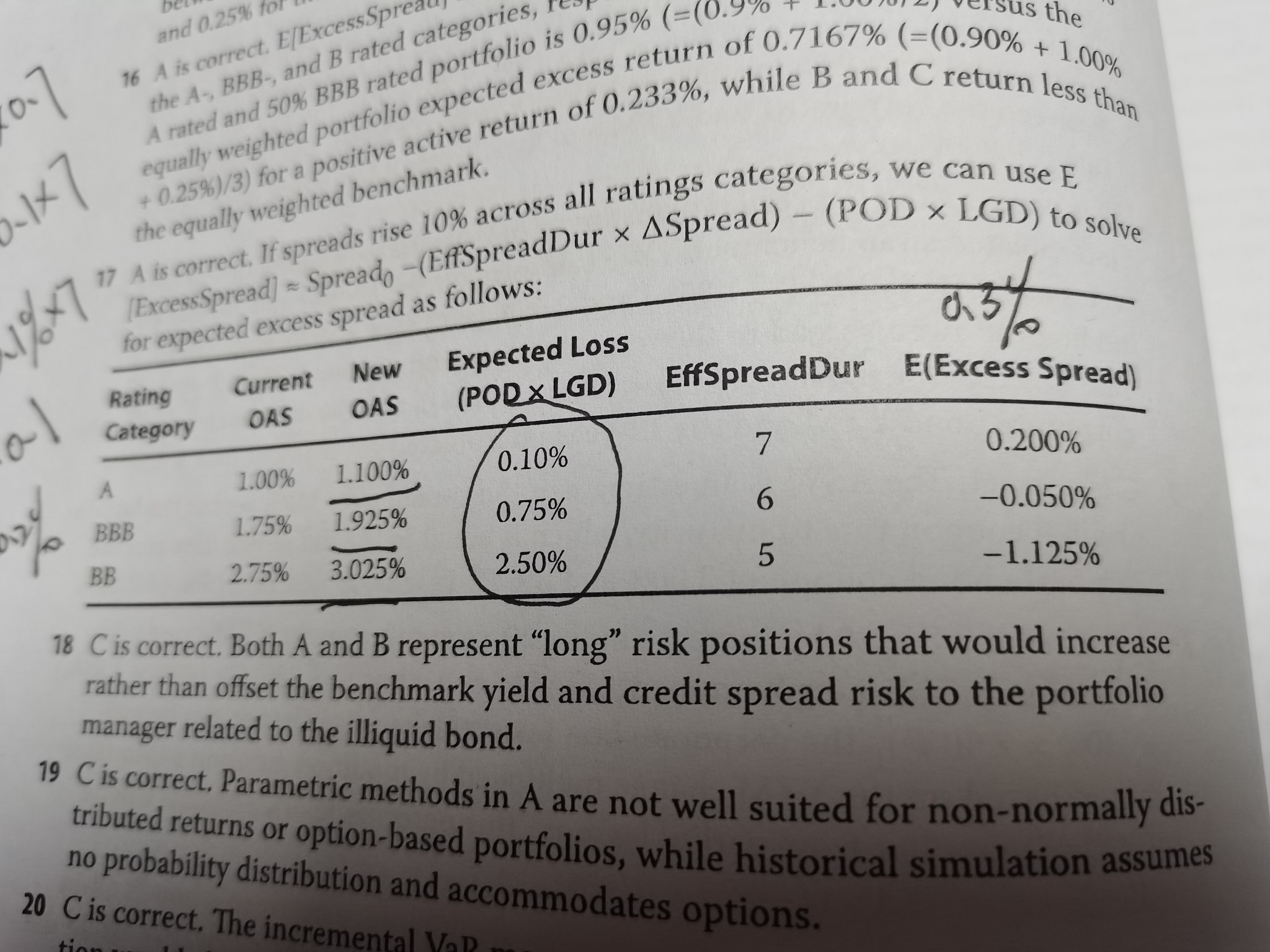 这里需要我们计算Expected excess return,提到利差瞬时变动,那么应该基于Spread0之上乘以0以体现时间因素。则A的超额利差回报为(-0.1%*7)-0.1%=-0.8%