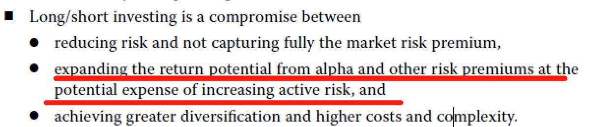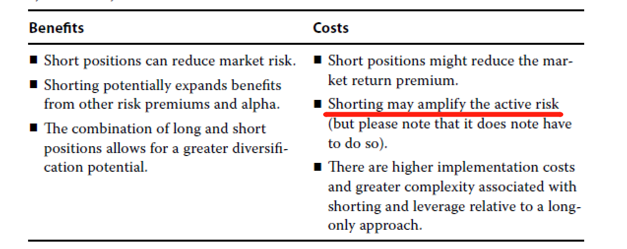 同学你好,long/short中因为有空头头寸,因此一般来说会增加active risk。参考如下原版书上的表格