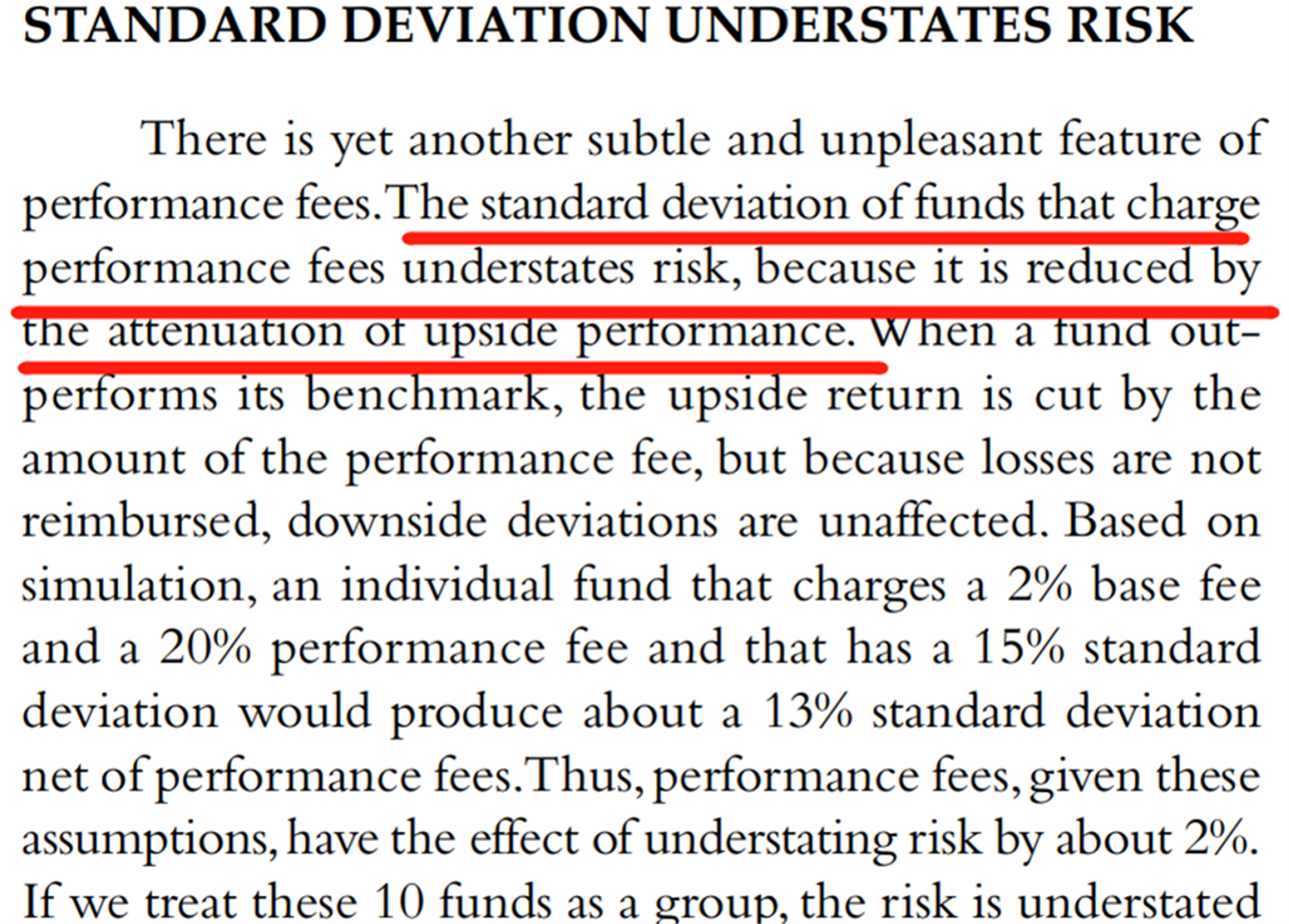 如果我们用net active return(扣除费用后的active return)的标准差来评估组合的风险,会低估组合的风险。在业绩差的时候因为基金经理不会分担亏损,因此下行波动率不受影响,在组合业绩较好的时候,因为收取了业绩提成,业绩的波动性降低了,导致整体的业绩的标准差是偏低的。
