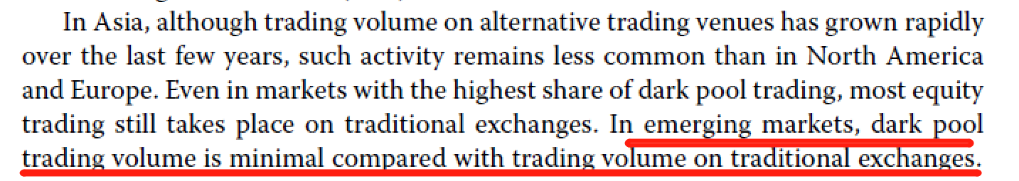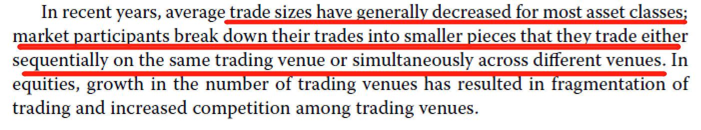 这是错的,因为现在投资者下单时会把订单拆小来交易,因此每个订单的平均规模是下降的。而在信息市场,dark pool的交易规模和交易所市场相比是非常小的。